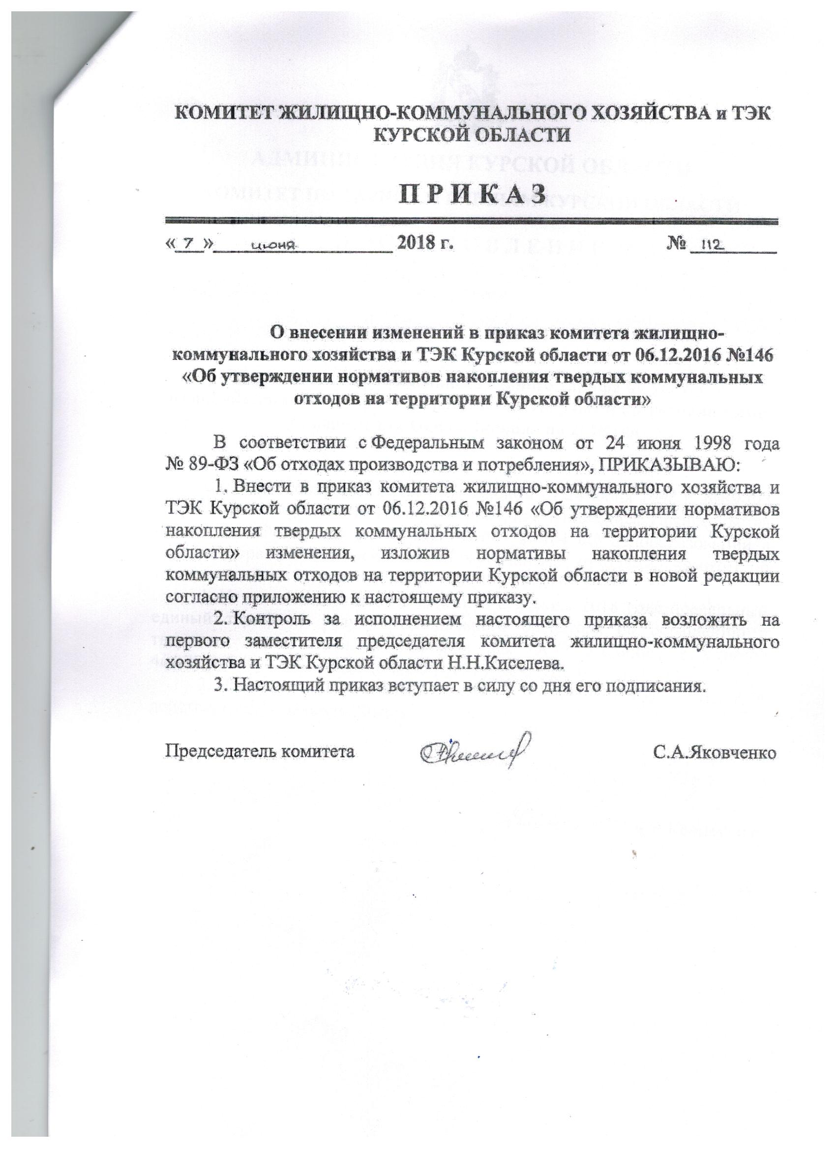 Приказ Комитета ЖКХ и ТЭК Курской области "О внесении изменений в приказ комитета ЖКХ и ТЭК Курской области от 06.12.2016 №146 "Об утверждении нормативов накопления твердых коммунальных отходов на территории Курской области" [342.26 Kb]